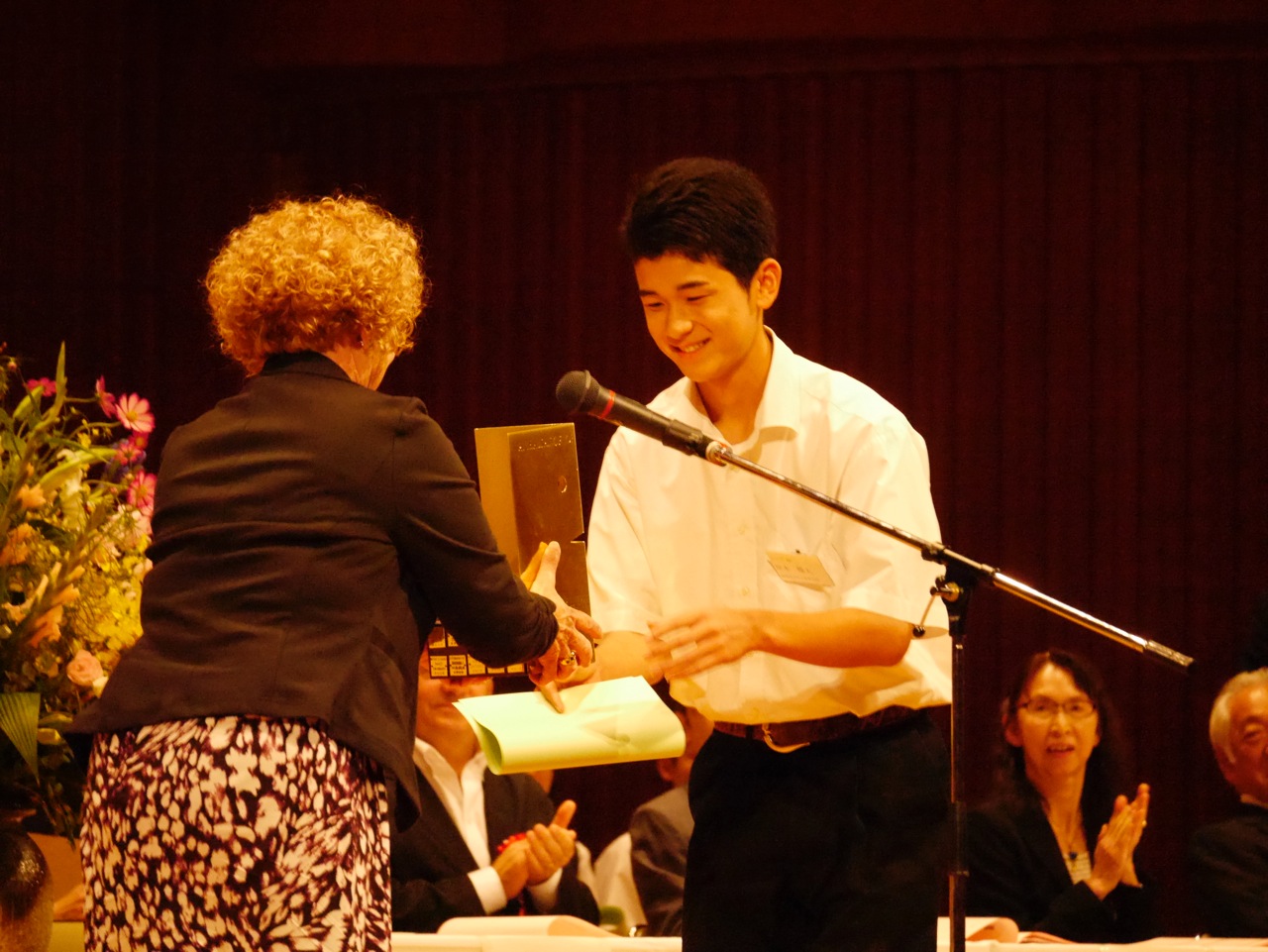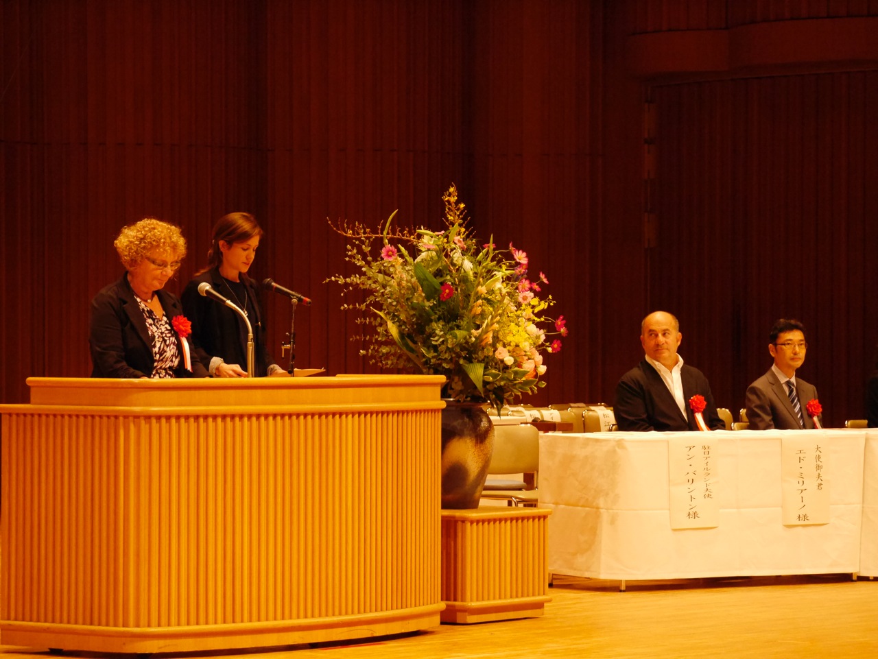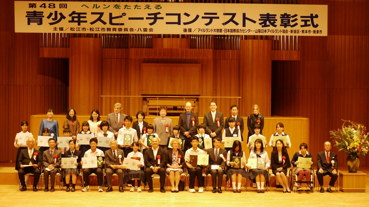 9月28日(日)、松江市総合文化センター(島根県松江市)で開催された「第48回ヘルンをたたえる青少年スピーチコンテスト」(後援:アイルランド大使館、山陰日本アイルランド協会ほか)の表彰式に、新任のアン・バリントン駐日アイルランド大使が、ご夫君を伴ってご臨席。挨拶を述べるとともに、最高賞の松江市長賞のシニアの部受賞にあわせて贈られるアイルランド大使賞を自ら贈賞されました。